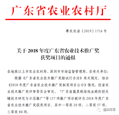 我司作为华南农业大学合作单位之一,参与“修复农田土壤污染的能源作物品种筛选及其配套技术应用项目”取得了良好的综合效益,根据《广东省农业技术推广奖励试行办法》有关规定,经省农业技术推广奖评审委员会审定,该项目获得2018年度广东省农业技术推广二等奖(粤农农函〔2019〕1716 号)。
